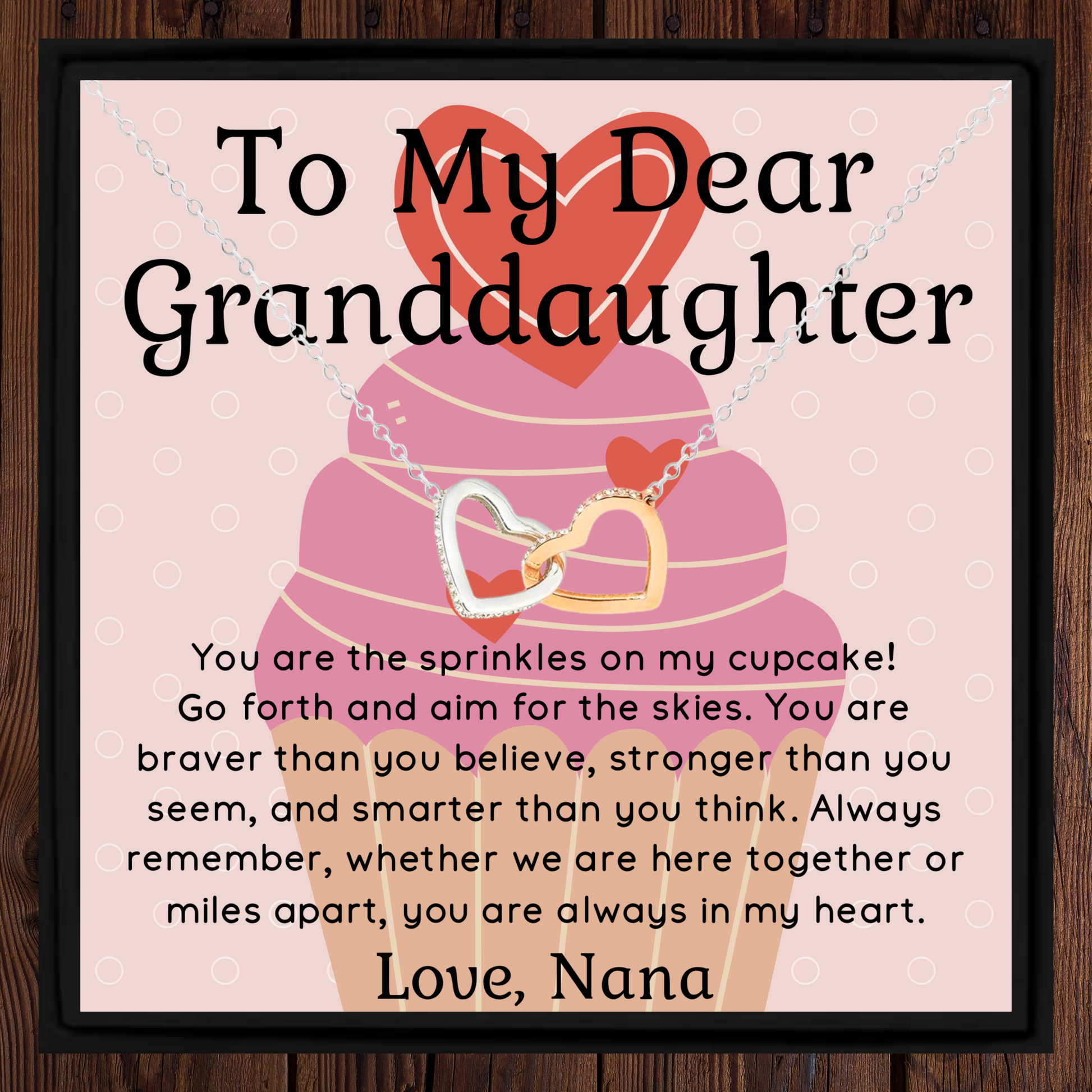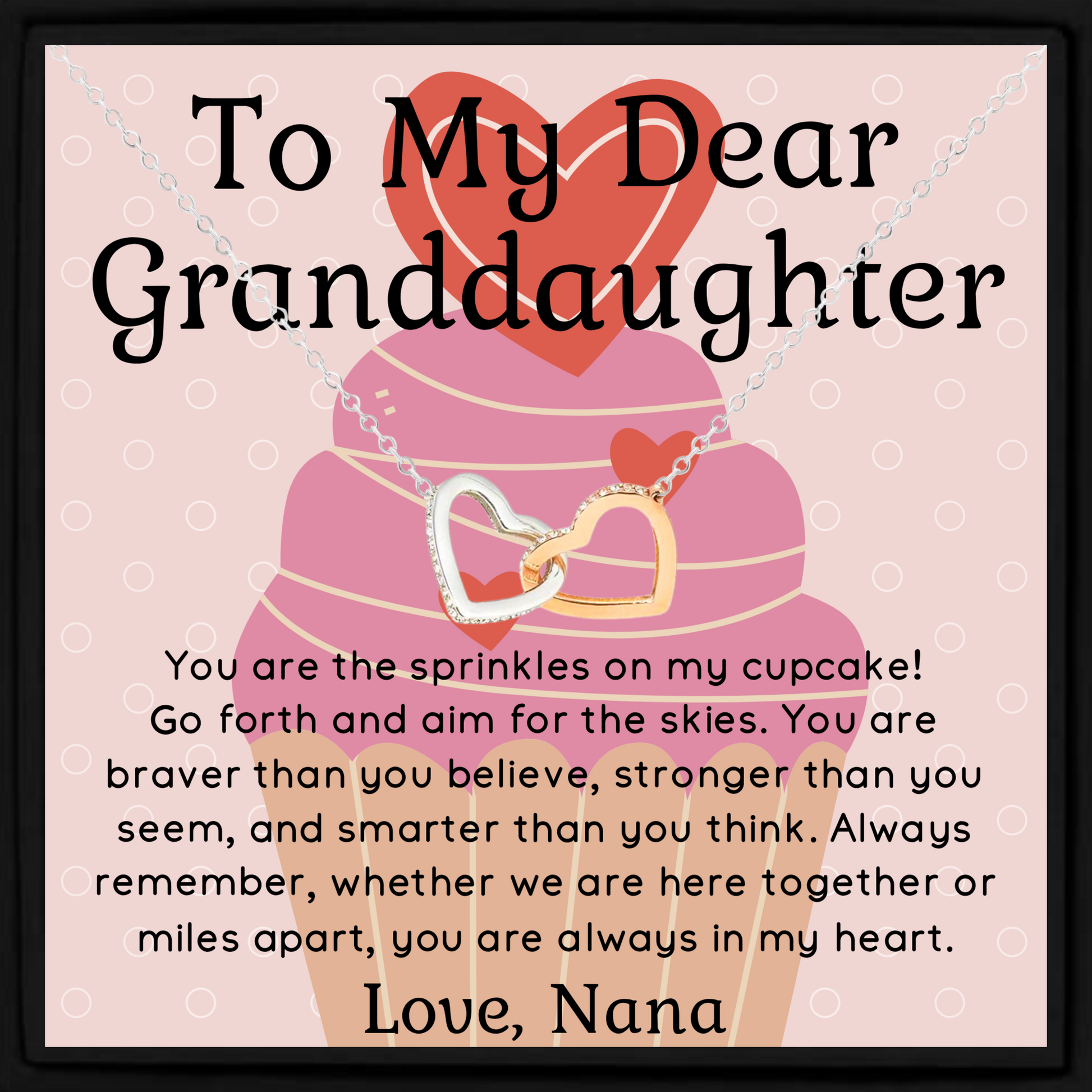 Give your granddaughter a heartfelt reminder of your love with this elegant interlocking hearts necklace, a thoughtful gift from Nana. Beautifully designed and ready to gift, this pendant arrives with a printed message card that reads: "You are the sprinkles on my cupcake! Go forth and aim for the skies..." – a joyful and uplifting sentiment she can carry close every day.